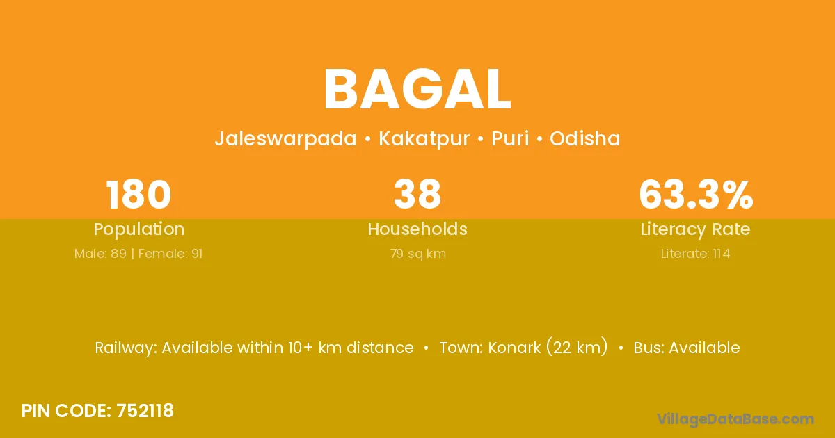 Konark (22 km) is the nearest town to Bagal village for major economic activities and is located approximately 22 km away.