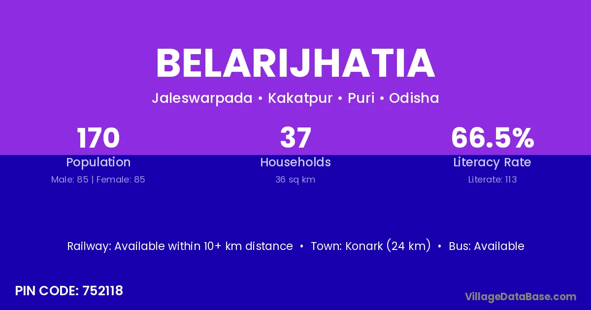 Konark (24 km) is the nearest town to Belarijhatia village for major economic activities and is located approximately 24 km away.