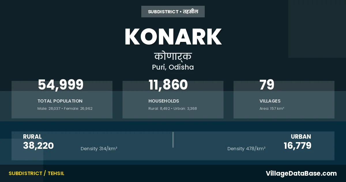 According to the 2011 census The total area of Konark Tehsil is 157 km², with a population of 54999 people. The population density is 351 inhabitants per square kilometre, and there are approximately 11860 houses in the sub district.