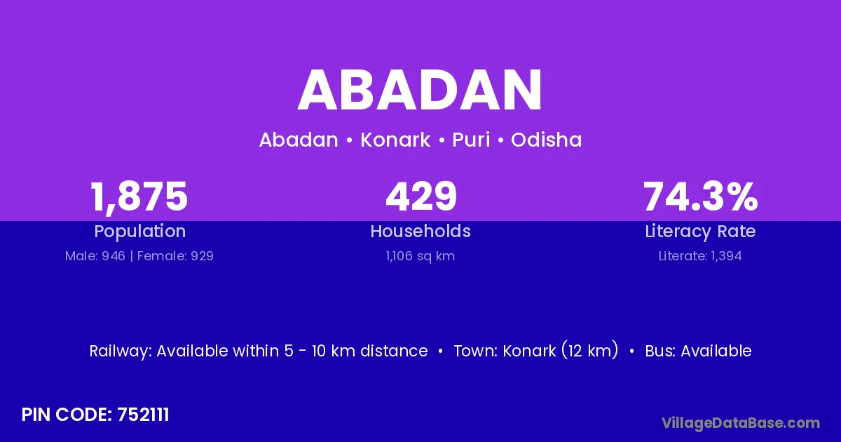 Konark (12 km) is the nearest town to Abadan village for major economic activities and is located approximately 12 km away.