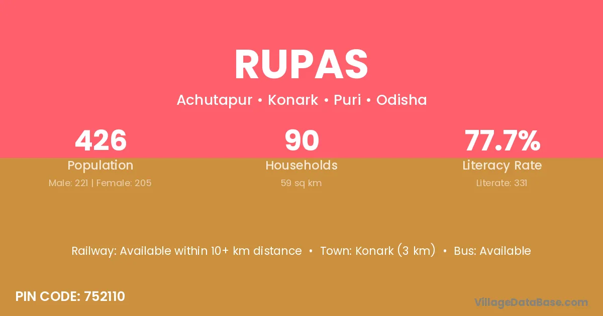 Konark (3 km) is the nearest town to Rupas village for major economic activities and is located approximately 3 km away.