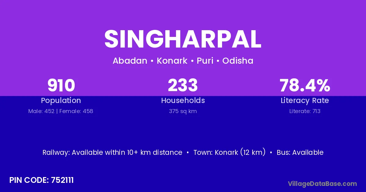 Konark (12 km) is the nearest town to Singharpal village for major economic activities and is located approximately 12 km away.