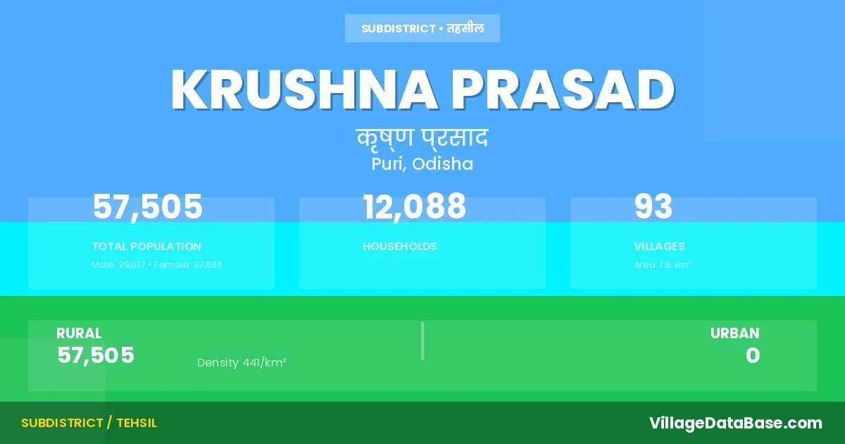 According to the 2011 census The total area of Krushna Prasad Tehsil is 131 km², with a population of 57505 people. The population density is 441 inhabitants per square kilometre, and there are approximately 12088 houses in the sub district.