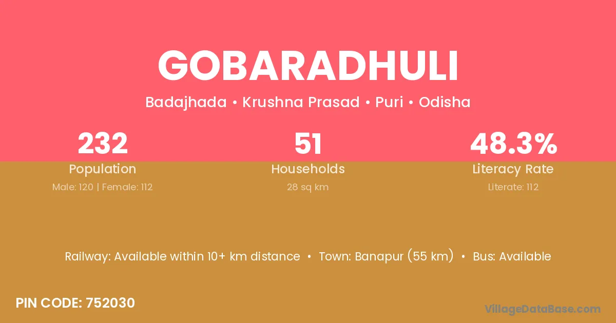 Banapur (55 km) is the nearest town to Gobaradhuli village for major economic activities and is located approximately 55 km away.