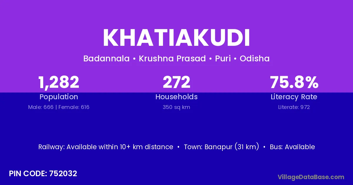 Banapur (31 km) is the nearest town to Khatiakudi village for major economic activities and is located approximately 31 km away.