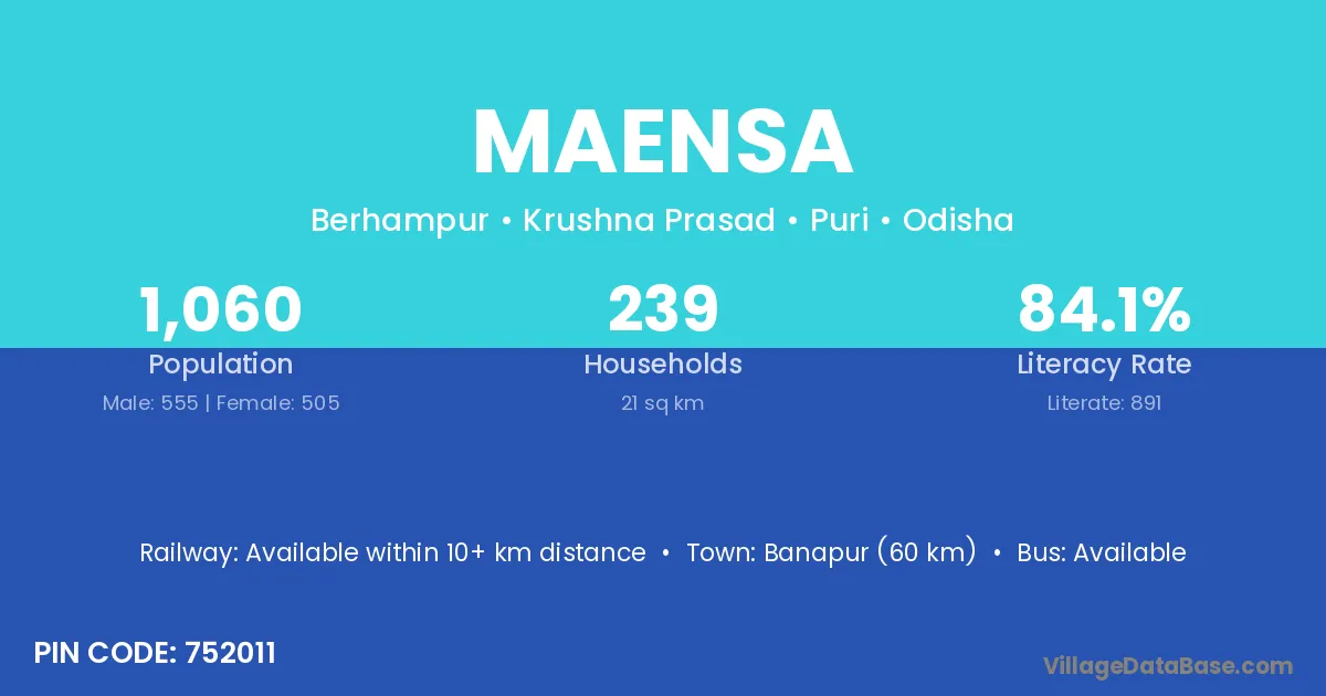 Banapur (60 km) is the nearest town to Maensa village for major economic activities and is located approximately 60 km away.