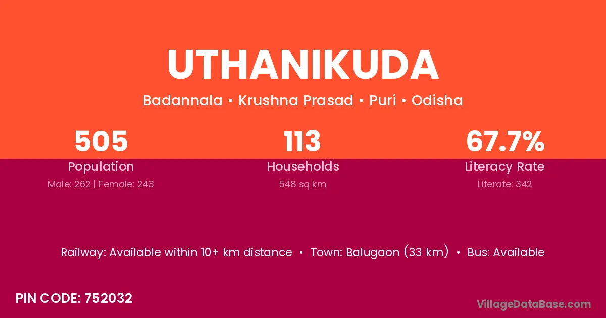 Uthanikuda village has a total population of 505 people, of which 262 are males and 243 are females.