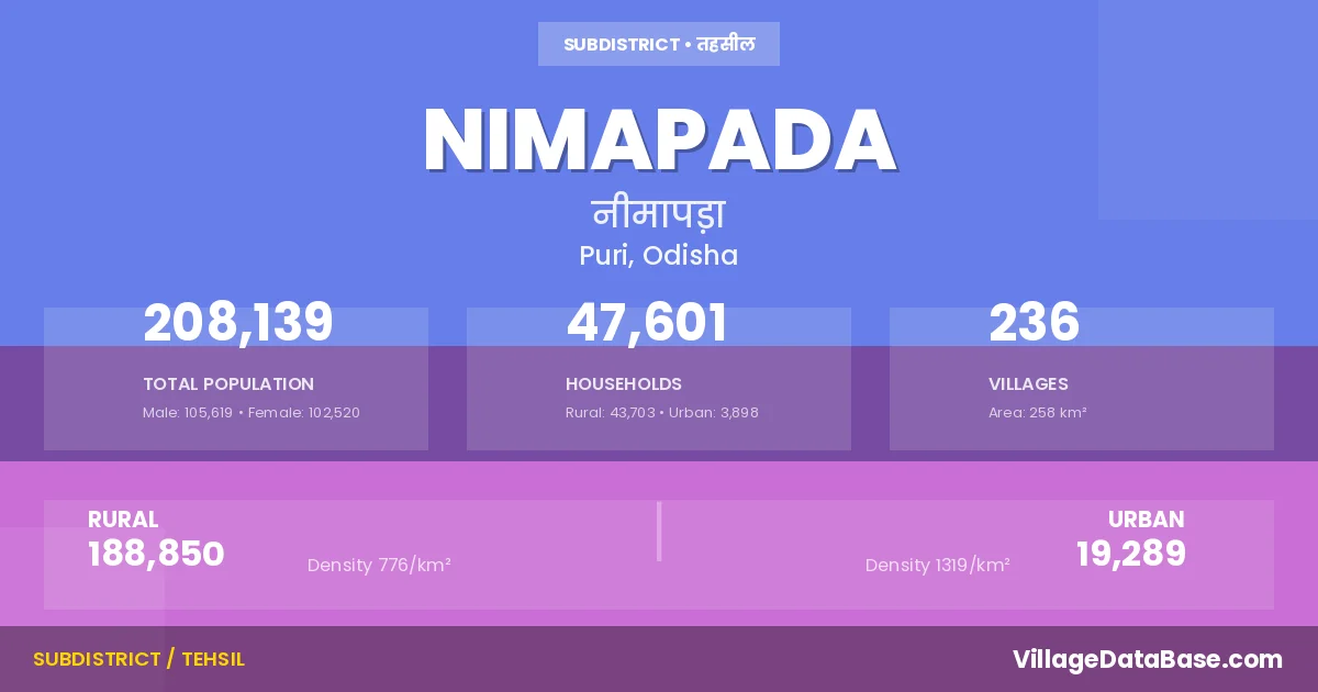 According to the 2011 census The total area of Nimapada Tehsil is 258 km², with a population of 208139 people. The population density is 807 inhabitants per square kilometre, and there are approximately 47601 houses in the sub district.