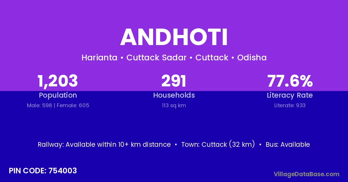 Nimapada (12 km) is the nearest town to Andhoti village for major economic activities and is located approximately 12 km away.