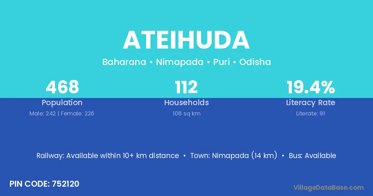 Nimapada (14 km) is the nearest town to Ateihuda village for major economic activities and is located approximately 14 km away.