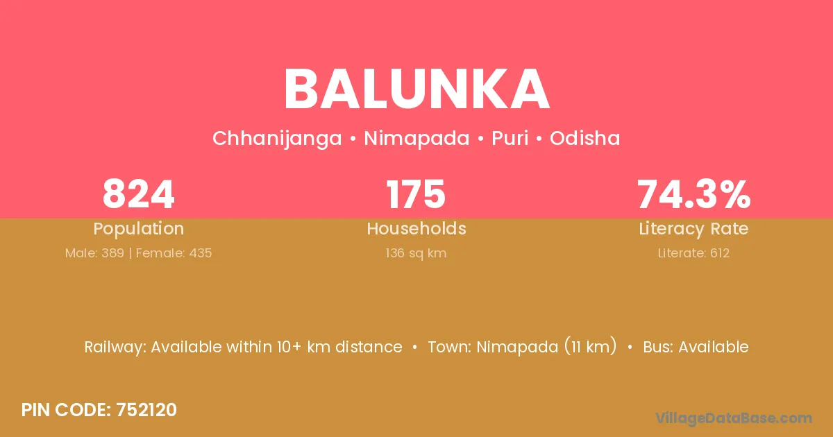 Nimapada (11 km) is the nearest town to Balunka village for major economic activities and is located approximately 11 km away.