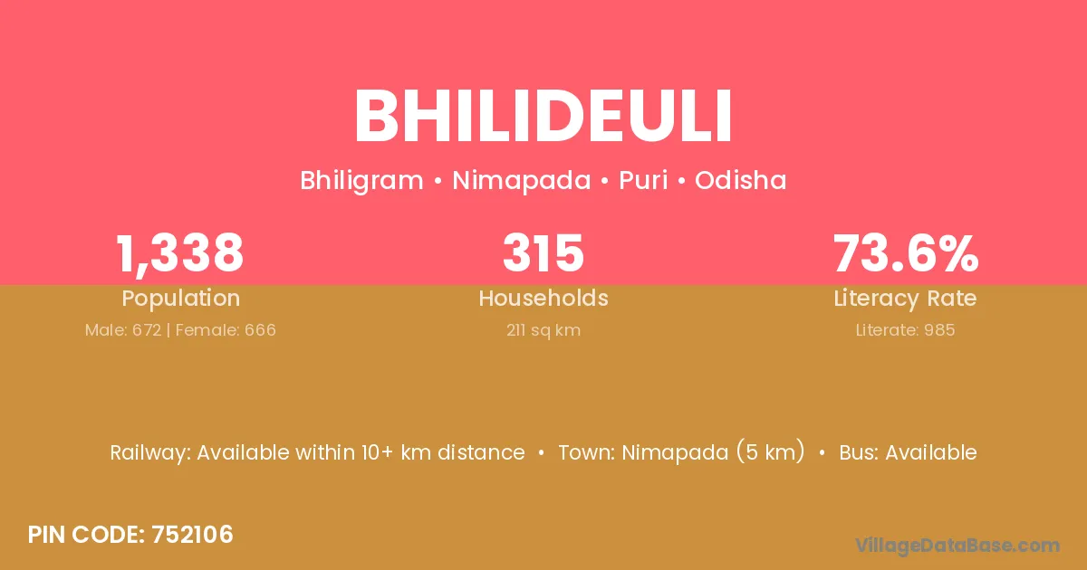 Bhilideuli village has a total population of 1,338 people, of which 672 are males and 666 are females.