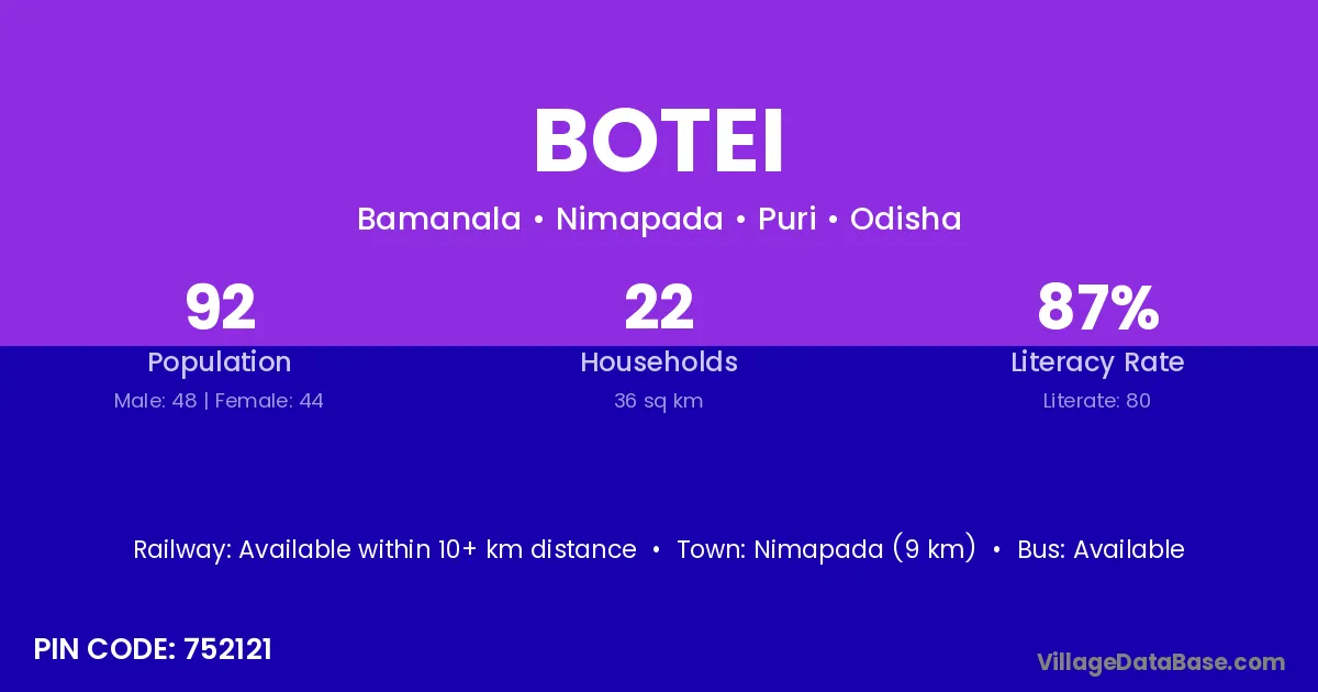 Nimapada (9 km) is the nearest town to Botei village for major economic activities and is located approximately 9 km away.