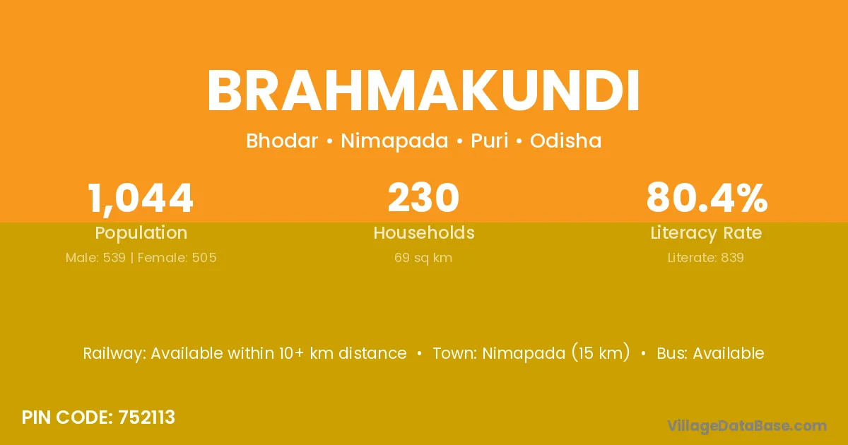 Brahmakundi village has a total population of 1,044 people, of which 539 are males and 505 are females.