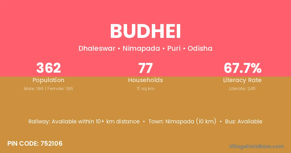 Nimapada (10 km) is the nearest town to Budhei village for major economic activities and is located approximately 10 km away.