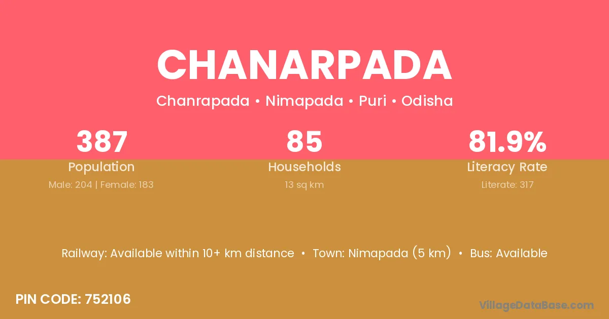 Nimapada (5 km) is the nearest town to Chanarpada village for major economic activities and is located approximately 5 km away.
