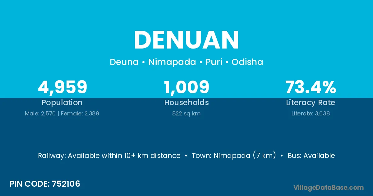 Nimapada (7 km) is the nearest town to Denuan village for major economic activities and is located approximately 7 km away.