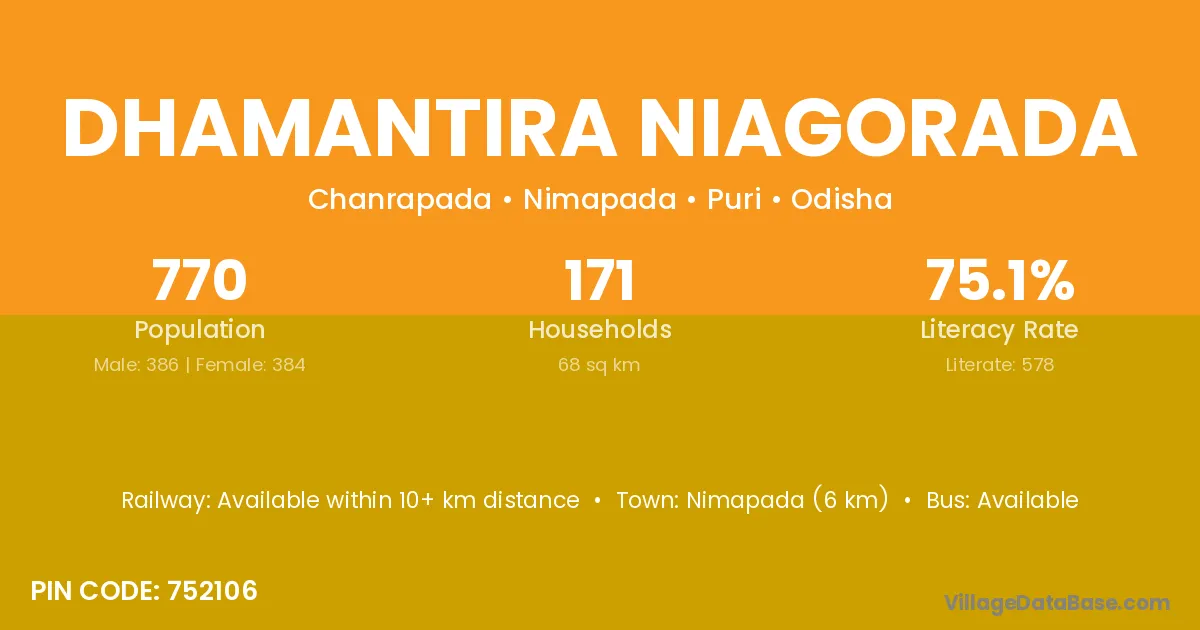Dhamantira Niagorada village has a total population of 770 people, of which 386 are males and 384 are females.
