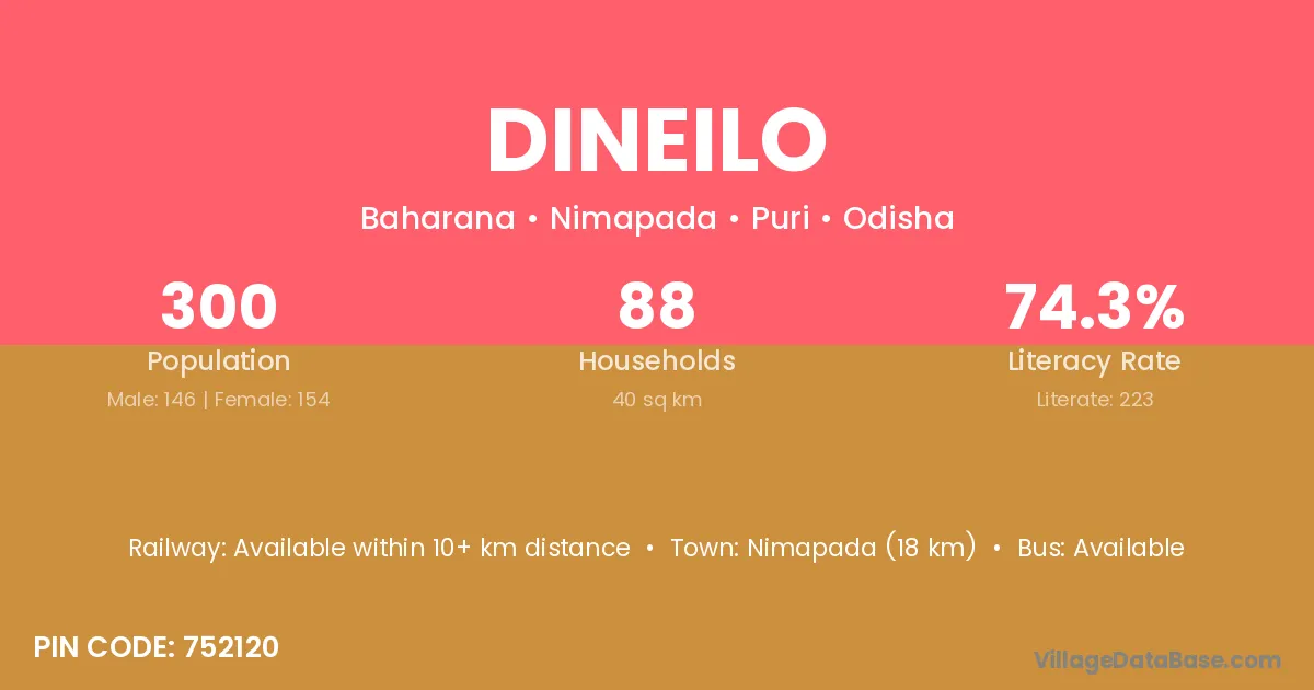 Nimapada (18 km) is the nearest town to Dineilo village for major economic activities and is located approximately 18 km away.