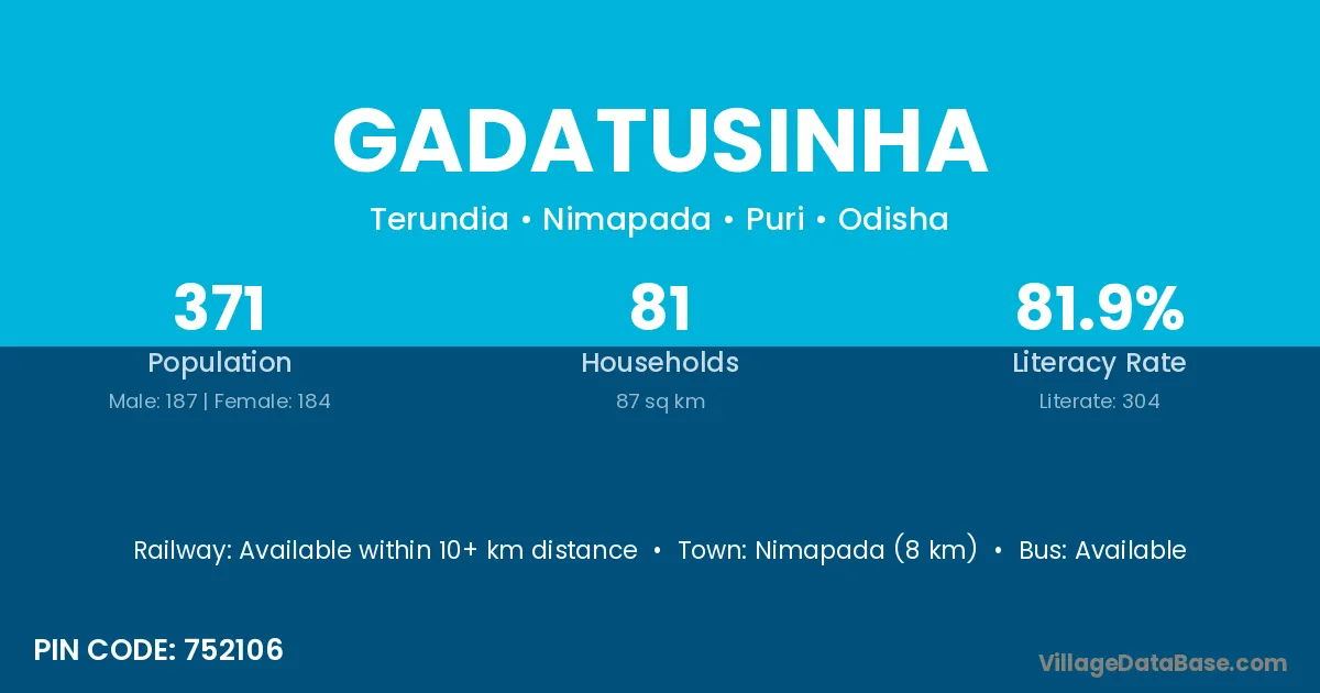 Gadatusinha village has a total population of 371 people, of which 187 are males and 184 are females.