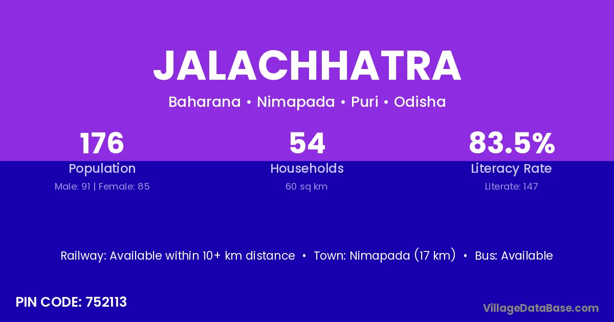 Nimapada (17 km) is the nearest town to Jalachhatra village for major economic activities and is located approximately 17 km away.