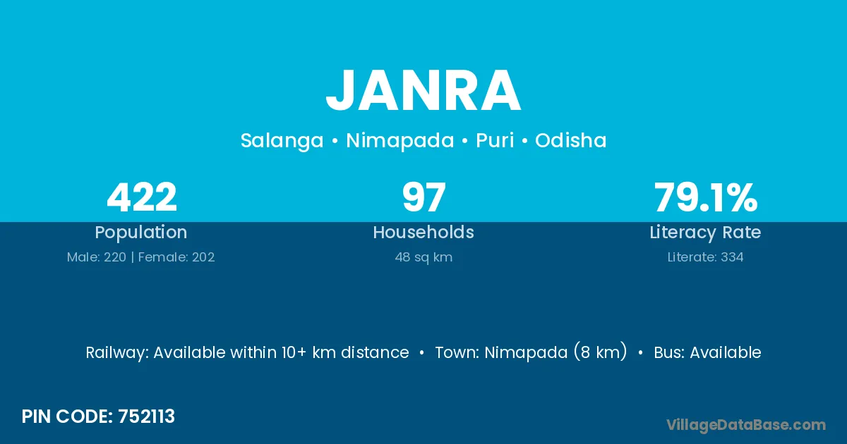 Nimapada (8 km) is the nearest town to Janra village for major economic activities and is located approximately 8 km away.