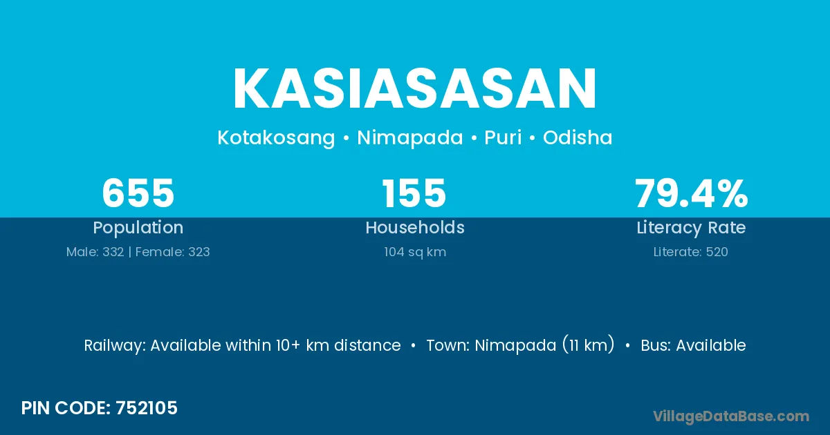 Nimapada (11 km) is the nearest town to Kasiasasan village for major economic activities and is located approximately 11 km away.