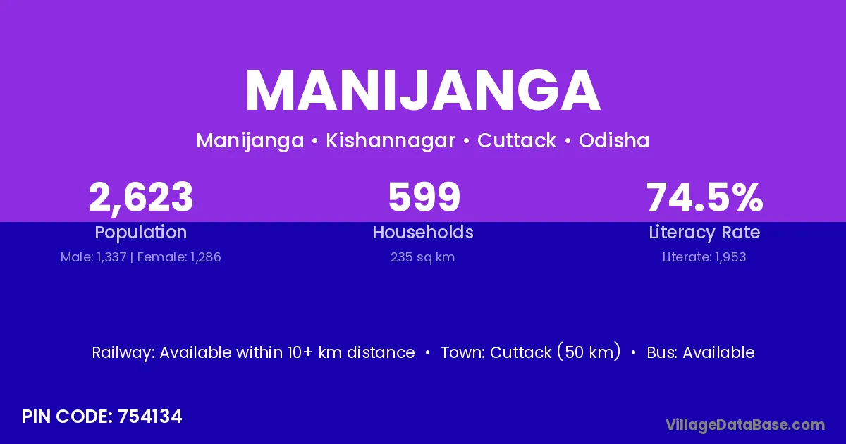 Bhubaneswar (33 km) is the nearest town to Manijanga village for major economic activities and is located approximately 33 km away.