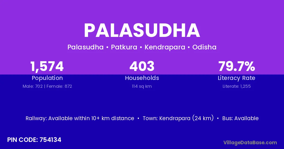 The literacy rate of Palasudha village is 71.61%. Male literacy stands at 76.68% and female literacy at 65.75%.
