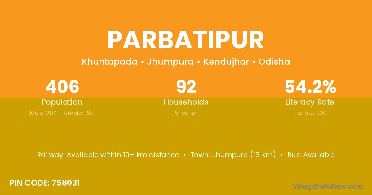 Nimapada (15 km) is the nearest town to Parbatipur village for major economic activities and is located approximately 15 km away.