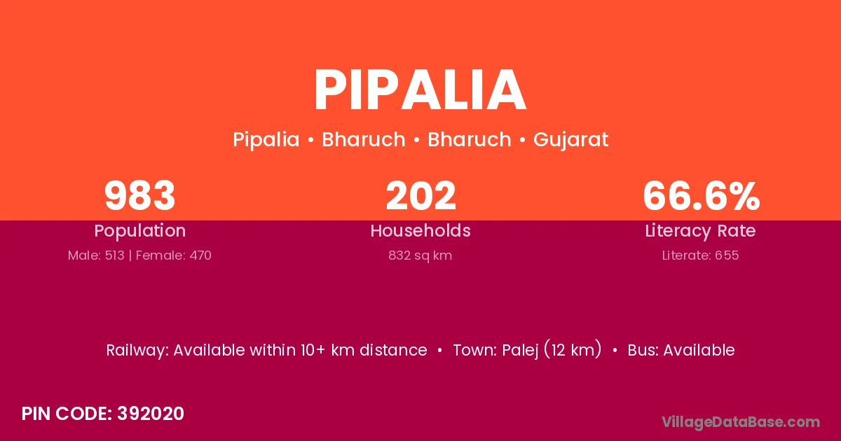 The literacy rate of Pipalia village is 87.62%. Male literacy stands at 87.50% and female literacy at 87.74%.