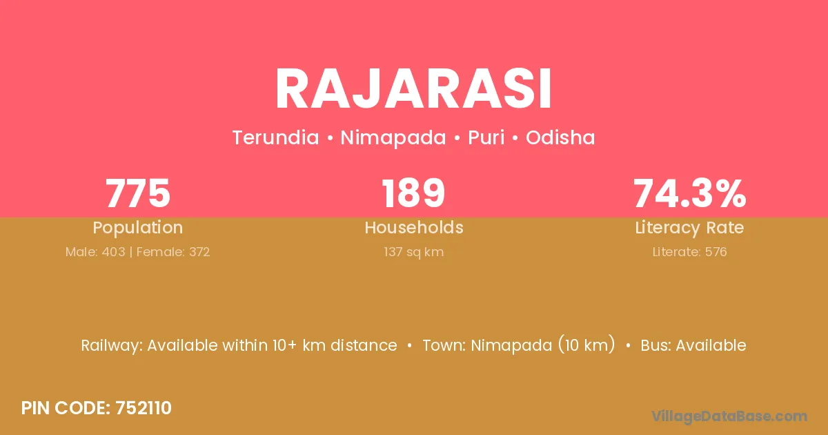 Nimapada (10 km) is the nearest town to Rajarasi village for major economic activities and is located approximately 10 km away.
