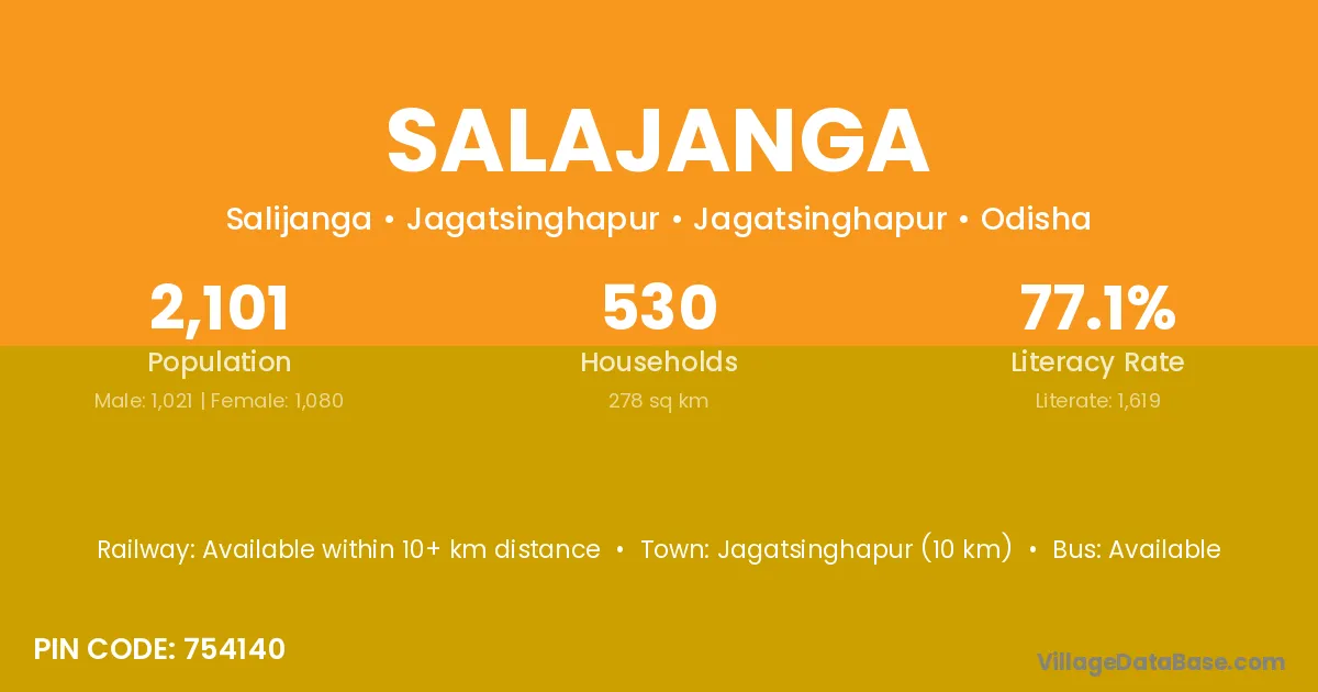 Pipili (6 km) is the nearest town to Salajanga village for major economic activities and is located approximately 6 km away.