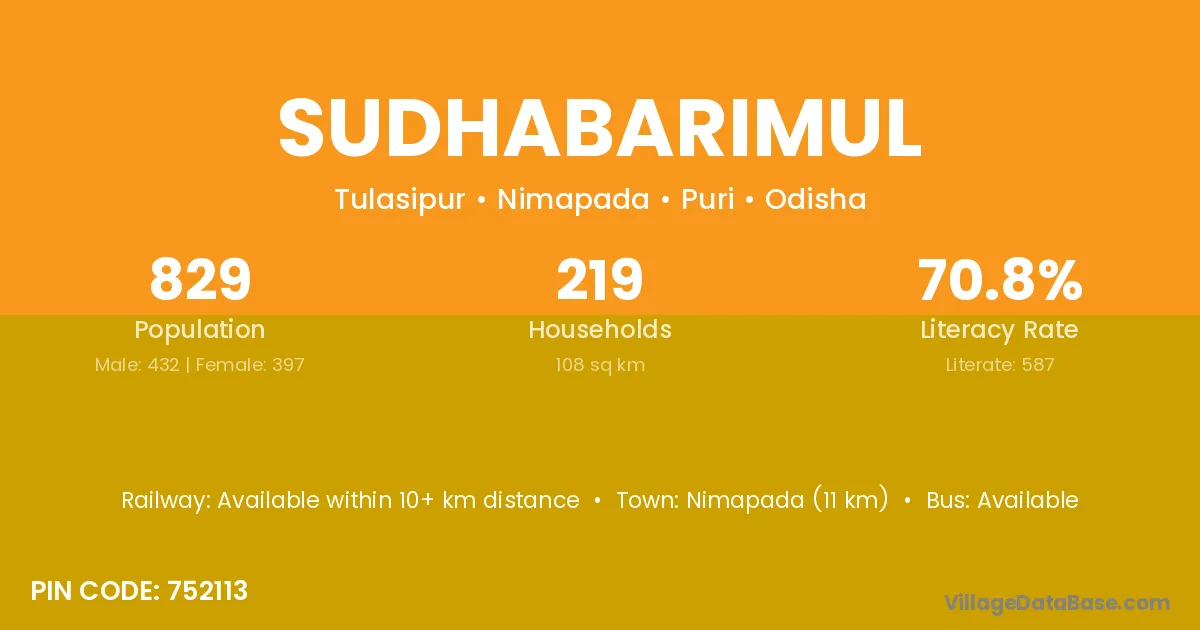 Nimapada (11 km) is the nearest town to Sudhabarimul village for major economic activities and is located approximately 11 km away.