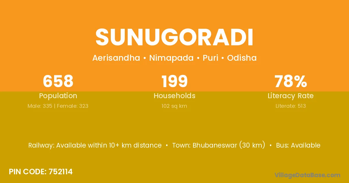 Bhubaneswar (30 km) is the nearest town to Sunugoradi village for major economic activities and is located approximately 30 km away.