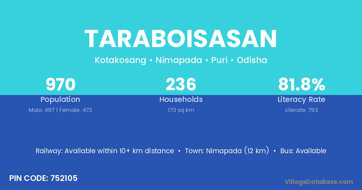 Nimapada (12 km) is the nearest town to Taraboisasan village for major economic activities and is located approximately 12 km away.