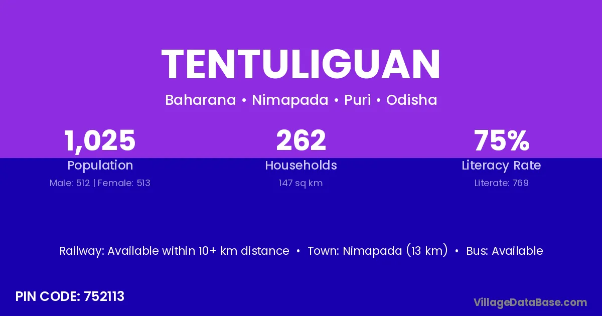 Nimapada (13 km) is the nearest town to Tentuliguan village for major economic activities and is located approximately 13 km away.