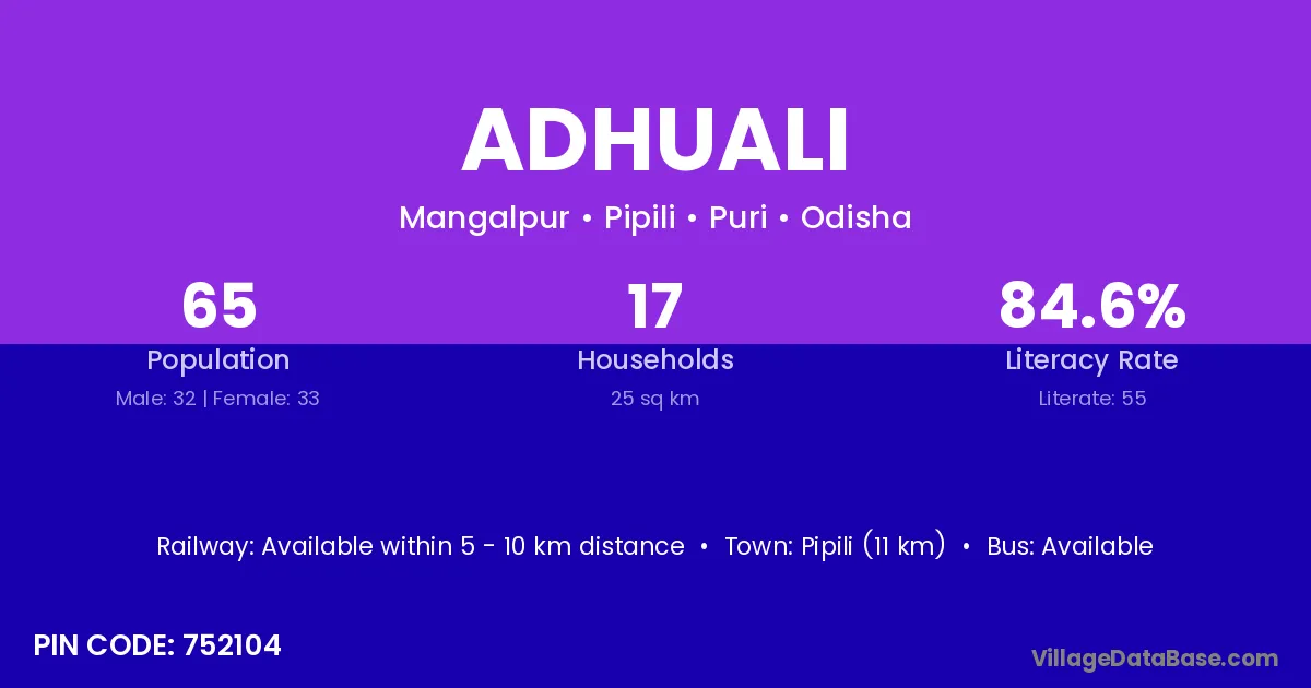 Pipili (11 km) is the nearest town to Adhuali village for major economic activities and is located approximately 11 km away.