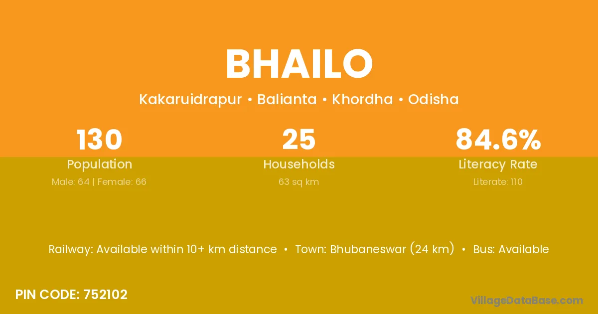 Pipili (8 km) is the nearest town to Bhailo village for major economic activities and is located approximately 8 km away.
