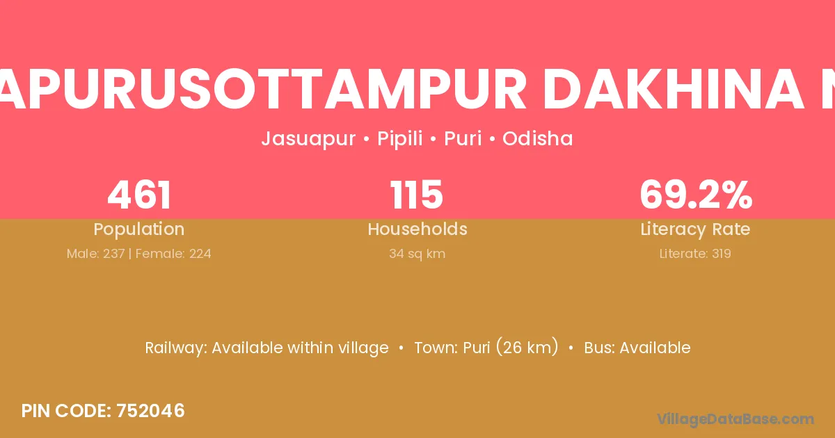 Birapurusottampur Dakhina No 1 village has a total population of 461 people, of which 237 are males and 224 are females.