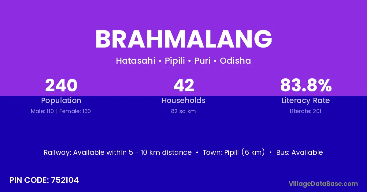 Pipili (6 km) is the nearest town to Brahmalang village for major economic activities and is located approximately 6 km away.