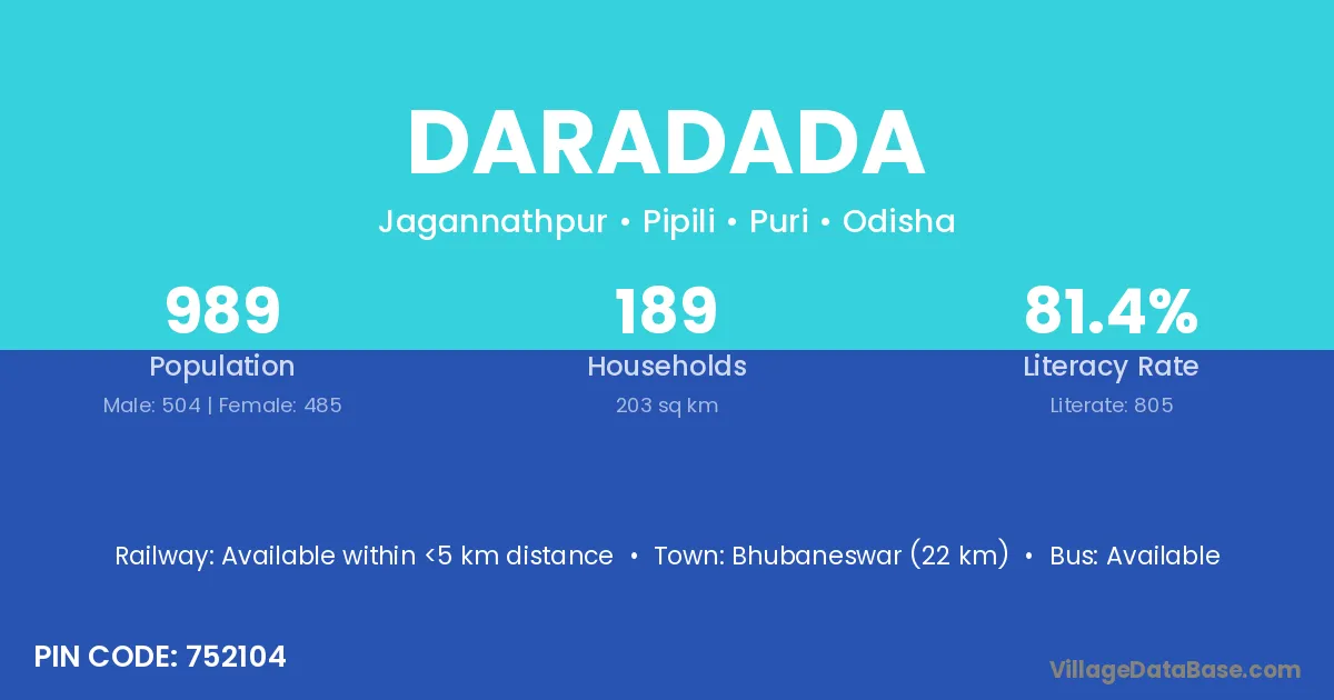 Bhubaneswar (22 km) is the nearest town to Daradada village for major economic activities and is located approximately 22 km away.