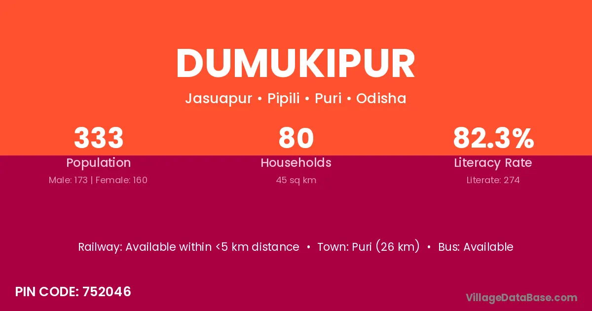 Puri (26 km) is the nearest town to Dumukipur village for major economic activities and is located approximately 26 km away.