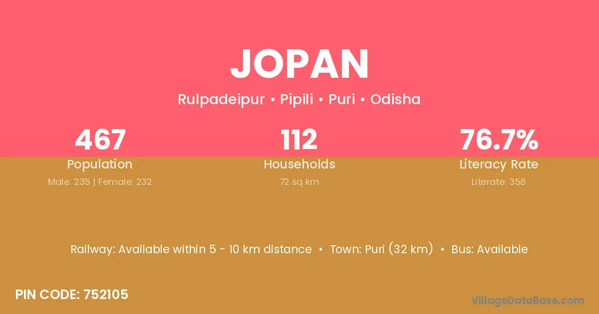 Puri (32 km) is the nearest town to Jopan village for major economic activities and is located approximately 32 km away.