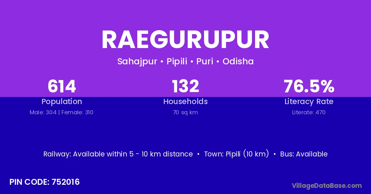 Pipili (10 km) is the nearest town to Raegurupur village for major economic activities and is located approximately 10 km away.