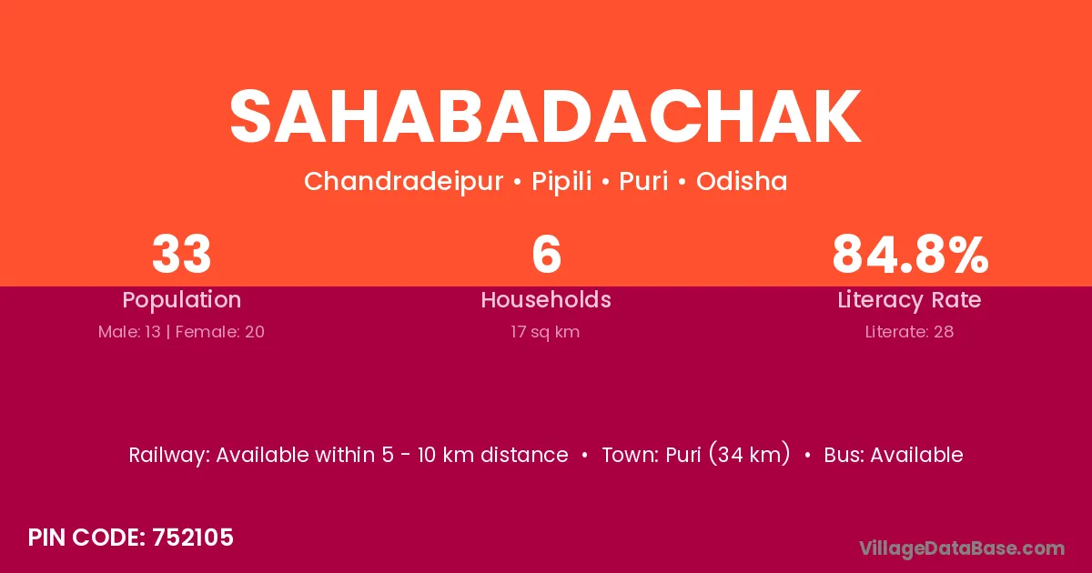 Puri (34 km) is the nearest town to Sahabadachak village for major economic activities and is located approximately 34 km away.
