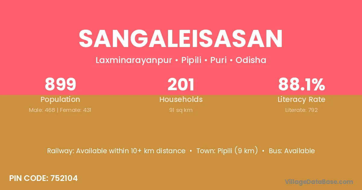 Pipili (9 km) is the nearest town to Sangaleisasan village for major economic activities and is located approximately 9 km away.