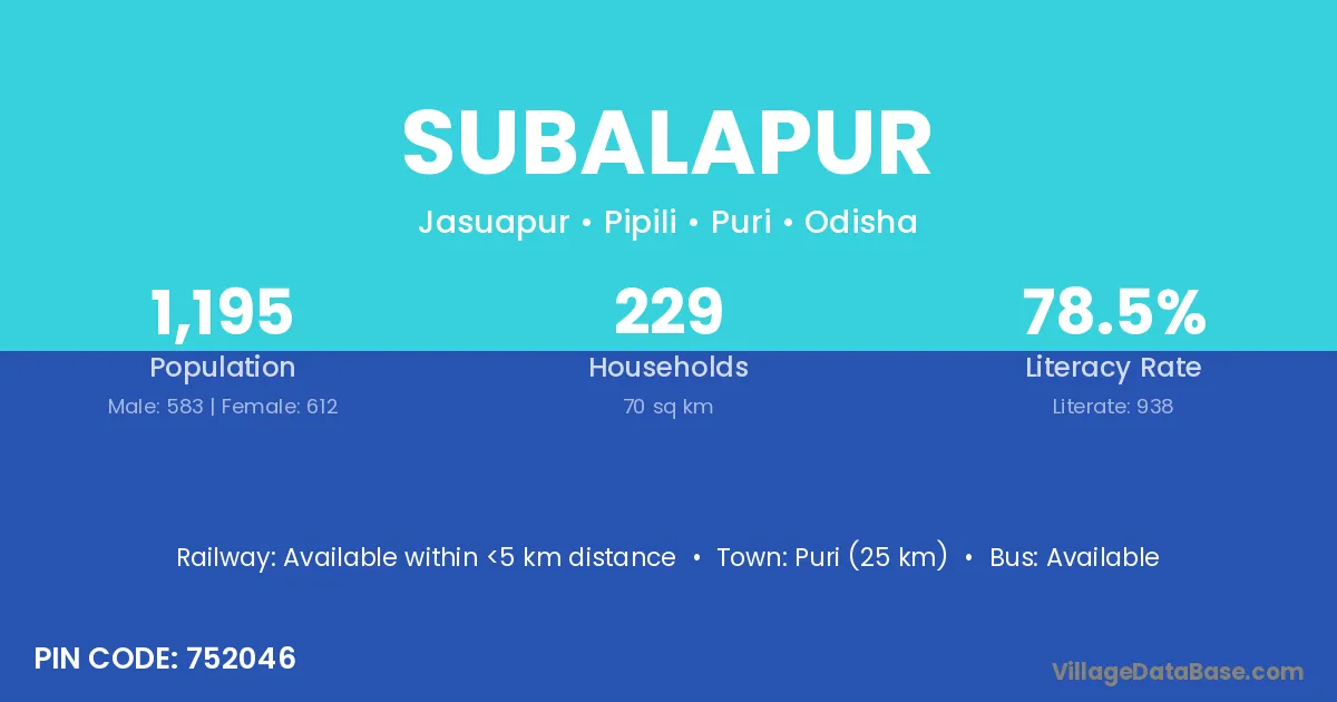 Puri (25 km) is the nearest town to Subalapur village for major economic activities and is located approximately 25 km away.