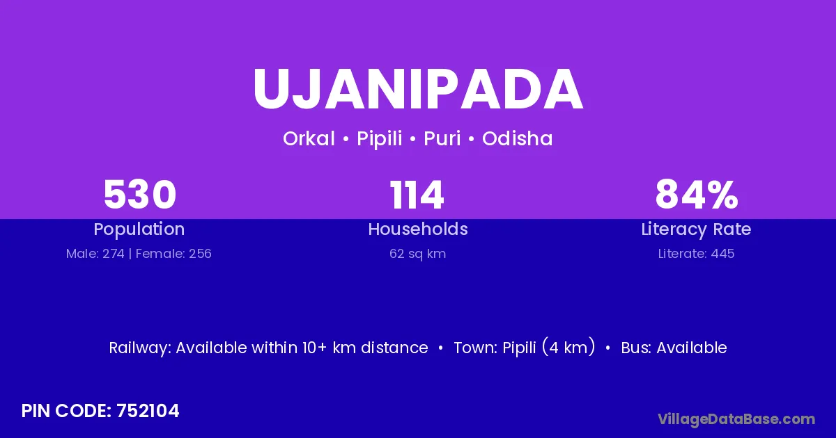 Pipili (4 km) is the nearest town to Ujanipada village for major economic activities and is located approximately 4 km away.