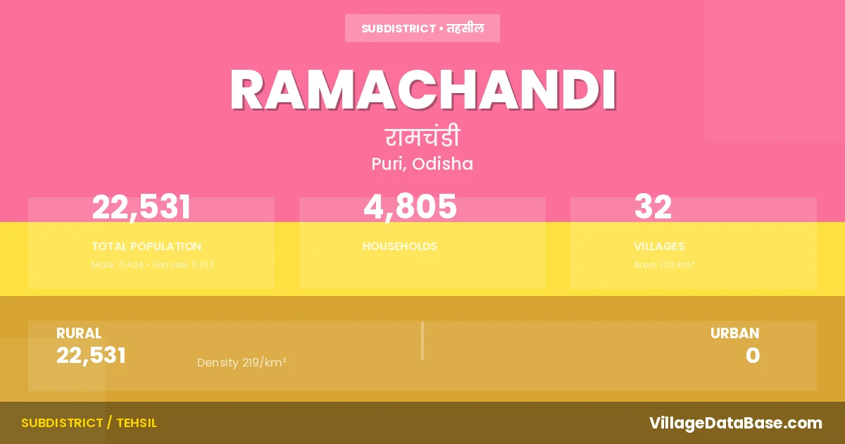 According to the 2011 census The total area of Ramachandi Tehsil is 103 km², with a population of 22531 people. The population density is 219 inhabitants per square kilometre, and there are approximately 4805 houses in the sub district.